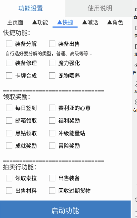 全自动跑图,全自动主线(疲劳值原因马上更新),分解装备和强化,刷图模式,委托模式,全自动换角色,领取和签到,拍卖,宠物喂养