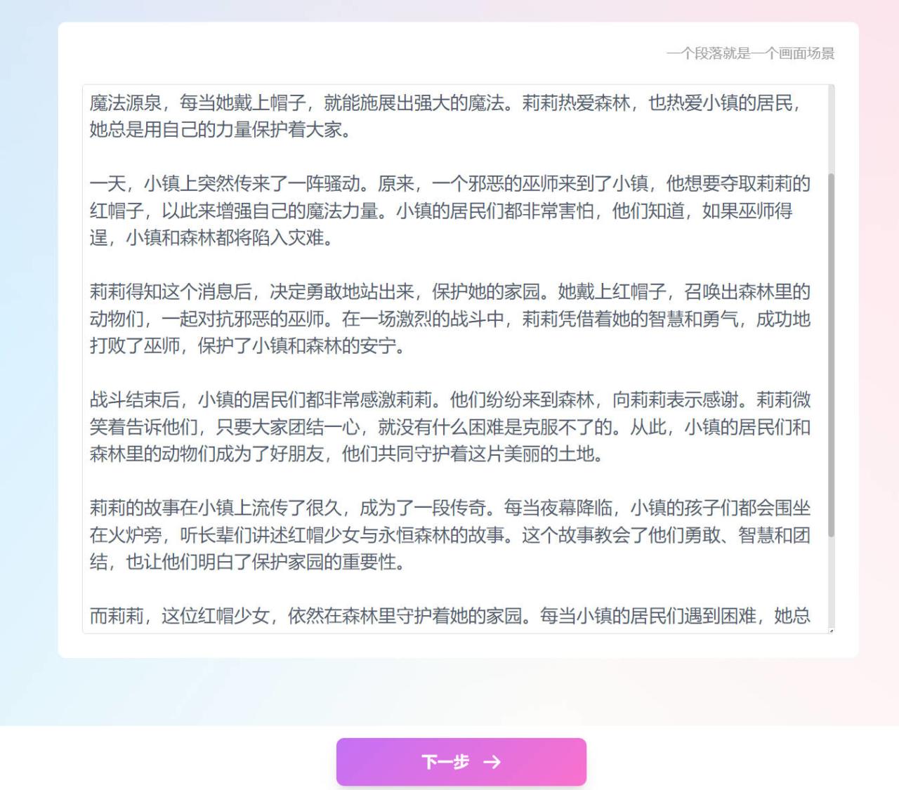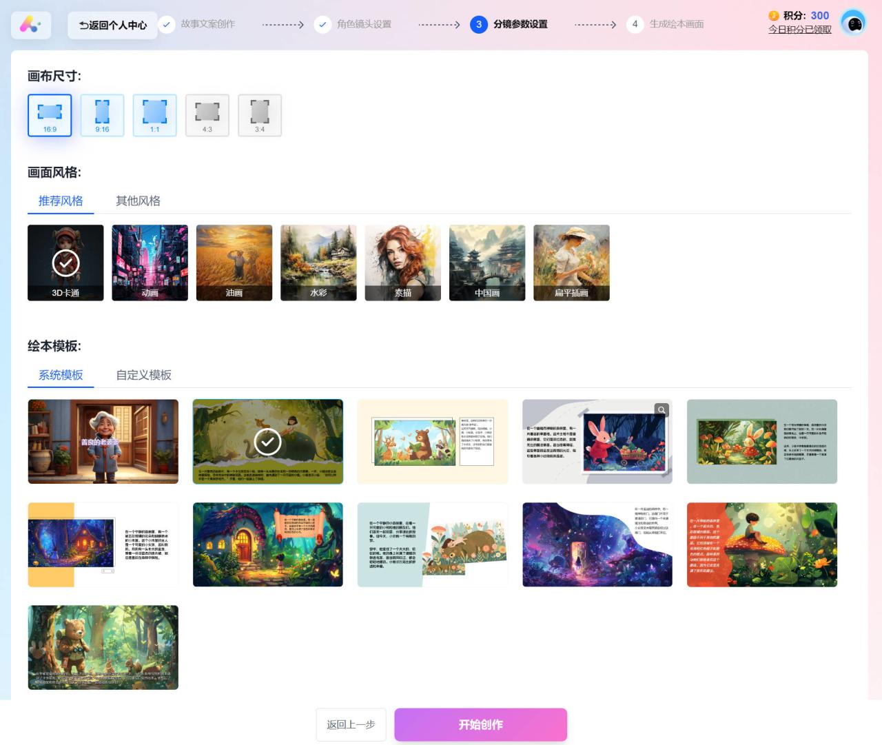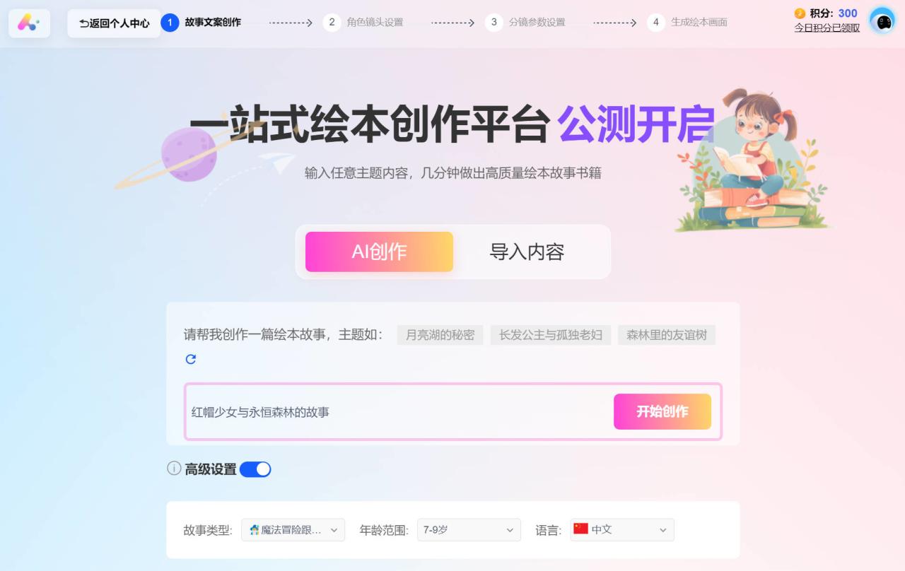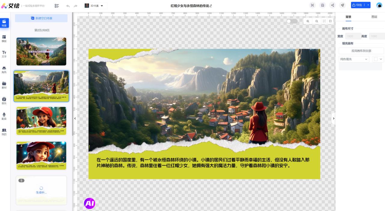 只需输入故事主题、风格、模板,软件就会自动创作故事内容,自动生成插画配图,自动根据模板生成成品,测试效果如下图。