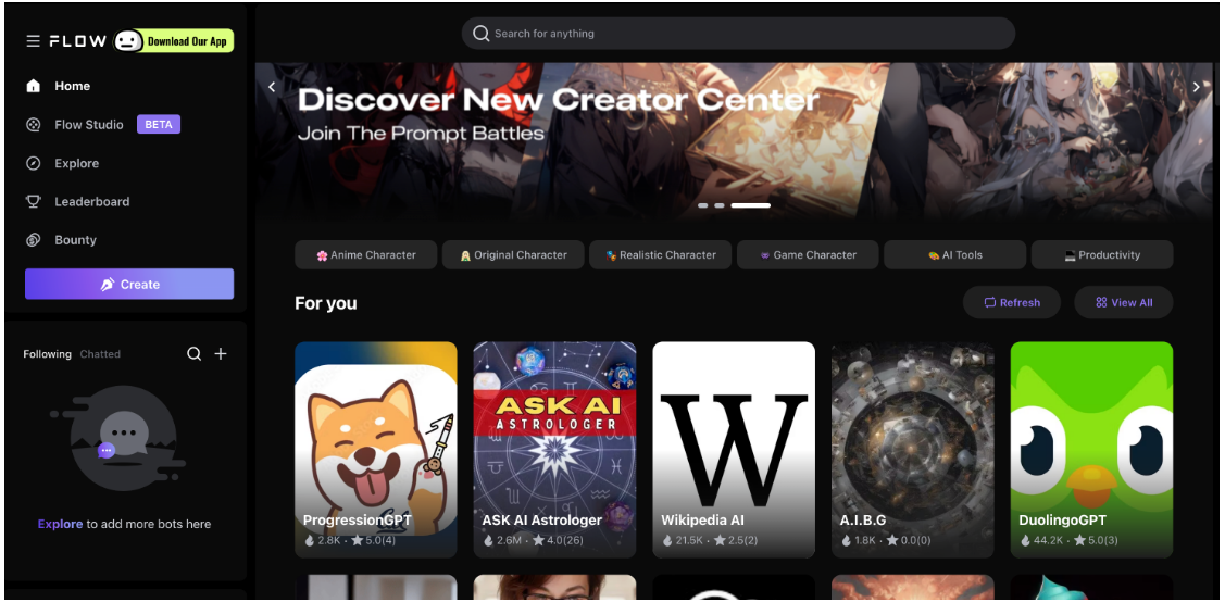 FlowGPT 推出了手机版 App,无广告、完全免费、无对话限制、一百多万个 Bot 可用。 并且,在手机版 App 上,有一个「Feed」流入口,在这个入口,就像刷短视频一样,点赞、关注等等,又是一个流量池子! 还可以创建自己的 Bot,别人用了应该会有积分收益等。
