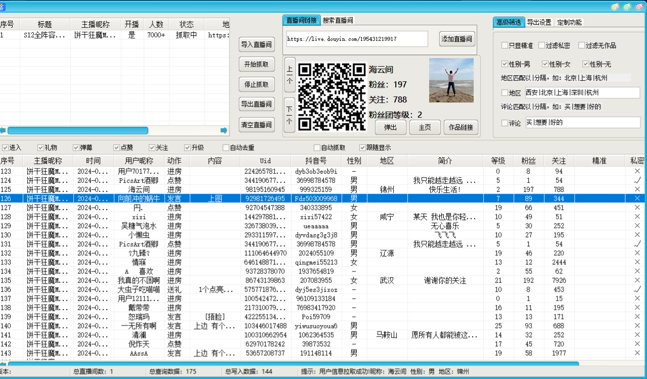 直播间采集脚本,支持筛选评论内容、性别、地区等等一键导出,不支持匿名直播间