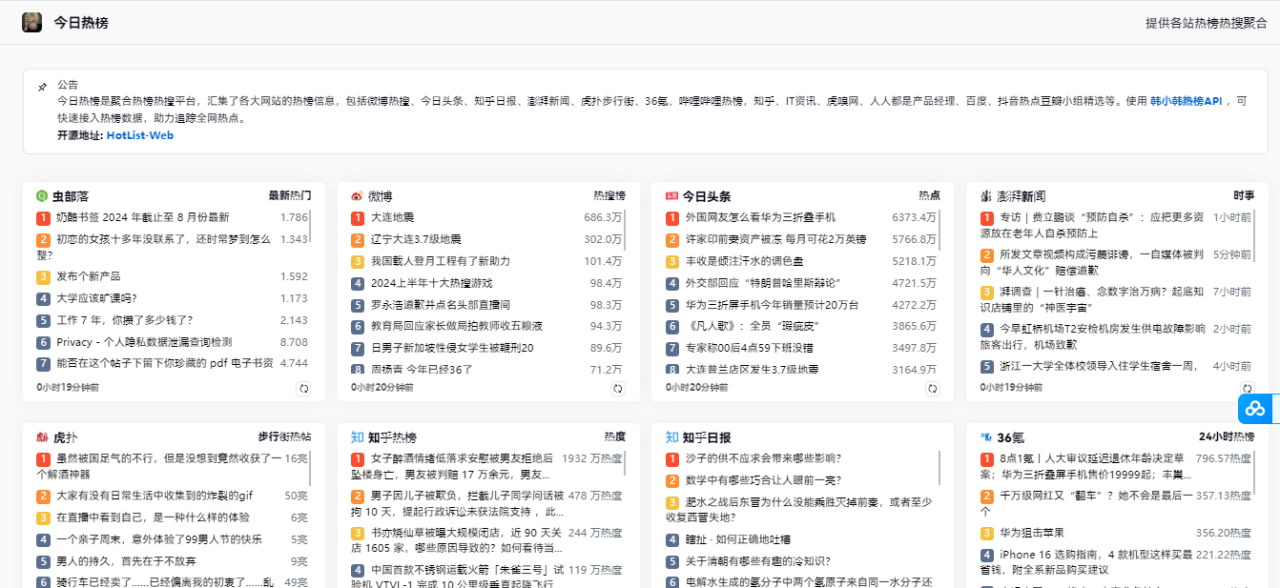HotList Web 今日热榜是一个聚合全网热榜和热搜的平台,汇聚全网热点,汇集了多个知名网站的热点信息,如微博热搜、今日头条、知乎日报、澎湃新闻、虎扑步行街、36氪、哔哩哔哩热榜、抖音热点等。用户可以通过该平台快速了解各类实时热门内容,简化信息获取过程。平台还支持通过韩小韩热榜API快速接入热榜数据,帮助用户高效追踪全网热点。