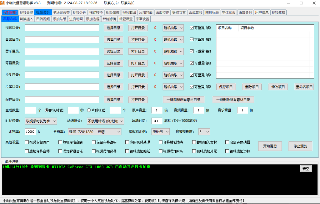 2. 视频合成:根据导入的视频文件夹内每个文件夹各自的视频或音频自动合成视频并输出,可以添加视频转场特效,添加背景音乐,随机左右翻转视频,添加片头片尾